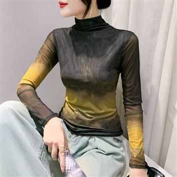 YF4143-图片色时尚秋冬渐变设计网纱弹力高领长袖蕾丝衫 气质外穿打底衫