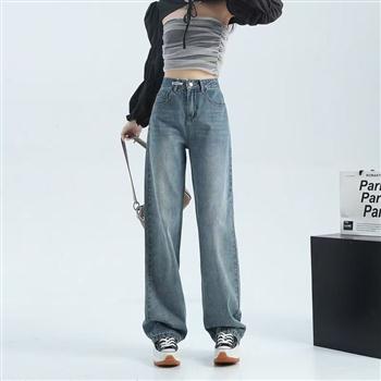 YF4144-图片色潮流新款系扣直筒洗水宽松显瘦百搭休闲牛仔裤 大码阔腿裤