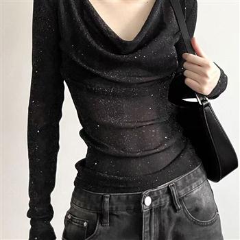 YF4147-图片色优雅长袖堆领闪闪亮长袖套头网纱别致网纱设计感蕾丝衫