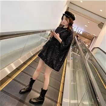 YF4139-(2色入内)BF风圆领短袖宽松大码原宿风亮片设计中长款连衣裙