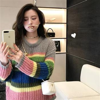 YF4019-图片色甜美彩虹编织提花圆领长袖宽松大码冬季新款针织外套
