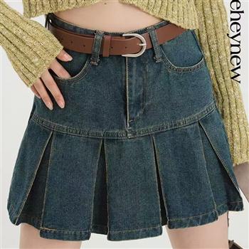 YF4022-图片色时尚辣妹高腰收腹拼接褶折A字短裙 复古蓝色新款牛仔裙