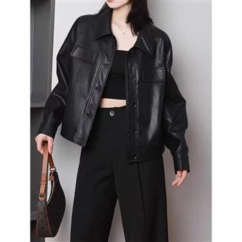 YF4024-(2色入内)时尚薄款POLO领长袖系扣短款车机休闲PU皮夹克外套