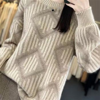 YF4025-(3色入内)冬季新款慵懒风圆领长袖提花菱形条纹大码针织毛衣上衣