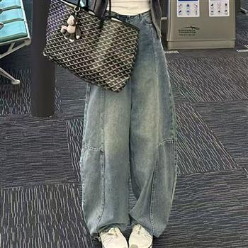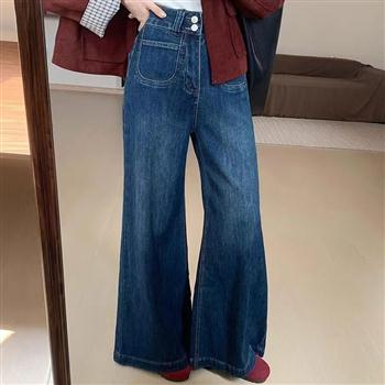 YF4029-图片色美式复古高腰水洗阔脚裤 慵懒风显瘦坠地感新款牛仔裤