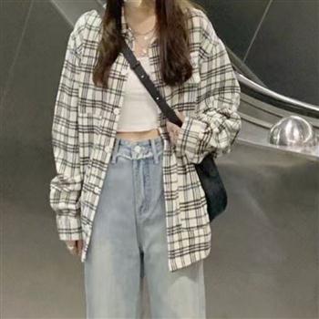 YF4033-图片色复古格子衫 慵懒风长袖翻领贴标大码显瘦休闲衬衫