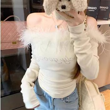 YF4034-(2色入内)一字肩毛毛抹胸性感欲女风弹力紧身钉珠字母烫钻T恤