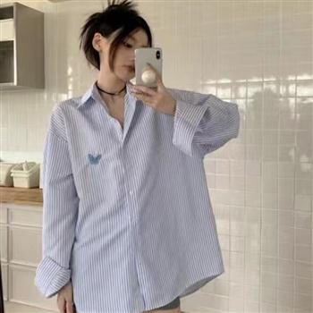 YF4027-(2色入内)甜美蝴蝶刺绣条纹慵懒风长袖翻领胖MM大码显瘦小众设计上衣