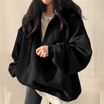 YF4028-(2色入内)港式慵懒风长袖连帽抽绳胖MM显瘦纯色百搭休闲卫衣潮