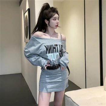 YF4038-(2色入内)性感时尚两穿设计一字肩字母印花长袖套头包臀系腰连衣裙
