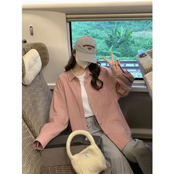 YF4040-图片色纯色简约慵懒风长袖翻领字母刺绣大码显瘦休闲衬衫
