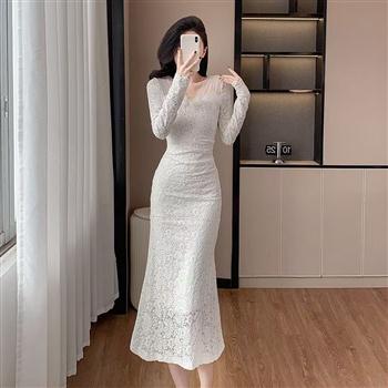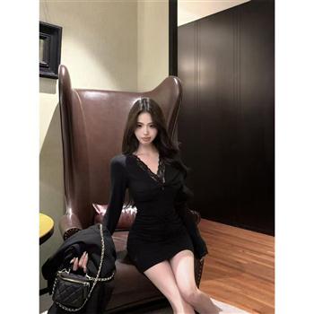 YF4052-(2色入内)名媛气质网纱拼接蕾丝V领弹力修腰包臀轻奢高级感连衣裙