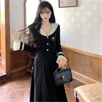 YF4042-图片色冬季赫本风OL白色娃娃领拼接纽扣束腰过膝长袖优雅连衣裙