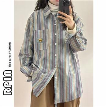 YF4043-(2色入内)韩版坚条纹小众设计宽松大码字母贴标口袋秋季休闲衬衫