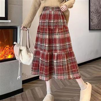 YF4045-(3色入内)秋冬高腰复古格子A字中长款保暖毛呢新款半身裙