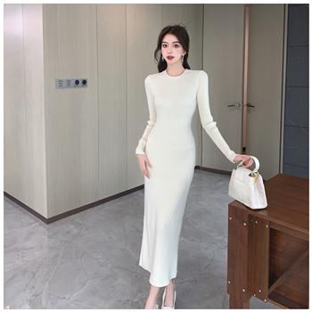 YF4046-(2色入内)冬季甜美圆领长袖弹力束腰包臀褶折优雅复古针织连衣裙