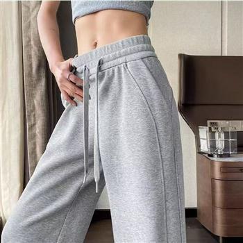 YF4047-(4色入内)时尚运动休闲卫衣裤 小众设计抽绳高腰弧边拼接直筒裤