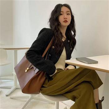 YF4048-(2色入内)时尚别致长袖系扣毛呢小香风宽松大码短款外套 上衣