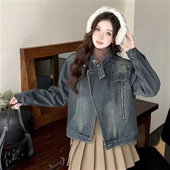 YF4049-图片色新款洗水系扣立领拼接拉链口袋短款牛仔衫 休闲夹克外套