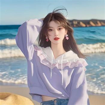 YF4056-图片色海军风波浪纹抽绳连帽慵懒风大码短款小众设计休闲卫衣潮