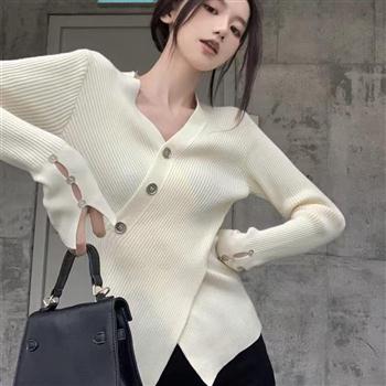 YF4057-(3色入内)时尚小众设计不规则交叉裁剪系扣长袖套头别致针织衫