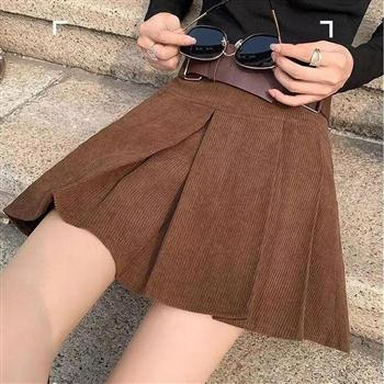 YF4054-(2色入内)复古灯芯绒收腹高腰褶折A字防走光内衬保暖大码新款短裙