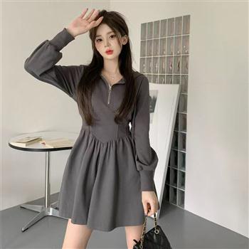YF3907-(2色入内)时尚秋冬长袖连帽拉链束腰褶折小众设计气质卫衣连衣裙