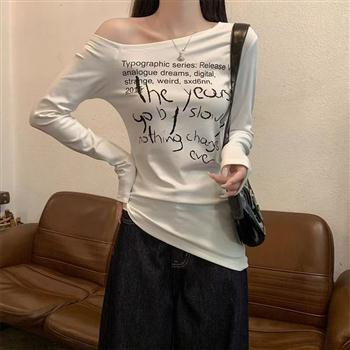 YF3910-(3色入内)性感露肩设计大少字母印花不规则裁剪下摆辣妹装T恤