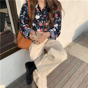 YF3911-(2色入内) 时尚春秋长袖翻领碎花田园风宽松大码雪纺衫 新款上衣
