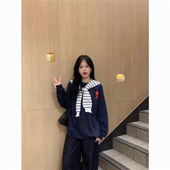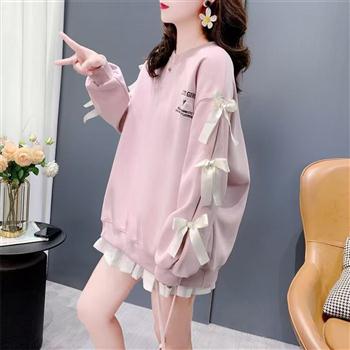 YF3912-(2色入内)韩版圆领系蝴蝶结长袖字母印花宽松大码学院风休闲卫衣潮