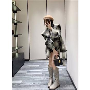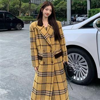 YF3936-图片色冬装复古格子中长款大码长袖翻领别致毛呢高级感大衣外套