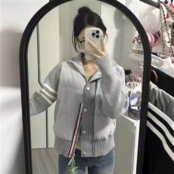 YF3917-(3色入内)2024冬装螺纹针织拼接立领系扣宽松大码假两件羽毛服 上衣