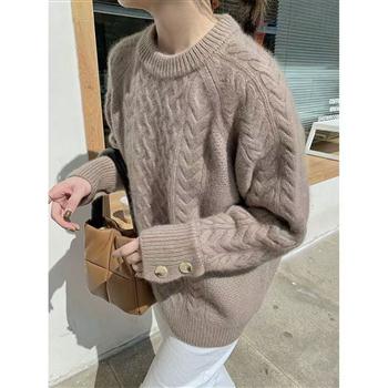 YF3919-(3色入内)港味长袖连肩圆领套头复古菱形扭纹设计感宽松大码针织外套