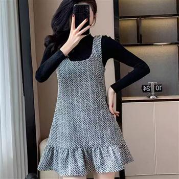 YF3923-图片色秋冬千鸟格吊带褶折荷叶边小香风背心裙 时尚百搭连衣裙