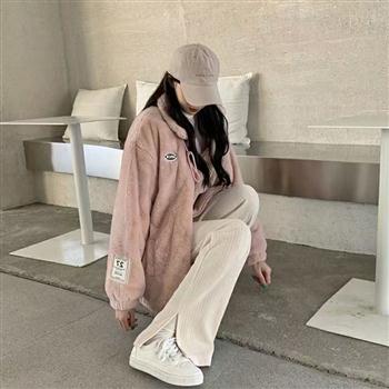 YF3941-图片色小可爱加厚长袖加毛翻领宽松显瘦羊羔绒设计感夹棉上衣