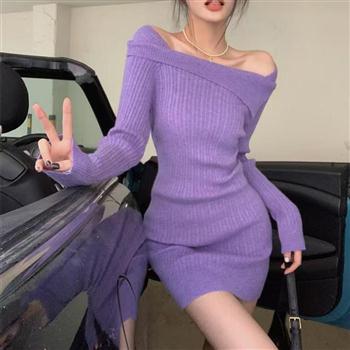 YF3927-(7色入内)一字肩不规则褶折修腰包臀长袖秋冬气质针织连衣裙