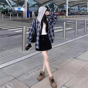 YF3921-图片色慵懒风休闲长袖连帽复古格子加大码宽松显瘦韩版衬衫