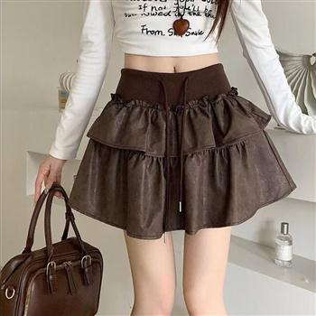 YF3922-(2色入内)秋冬仿皮草抽绳褶折A字防走光蛋糕裙 辣妹显瘦chic短裙
