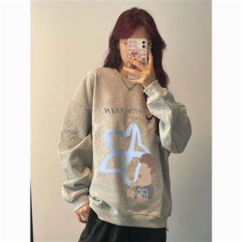 YF3930-图片色慵懒风小众设计头像花朵字母印花宽松大码休闲百搭卫衣潮