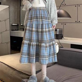 YF3932-(3色入内)韩版高腰复古格子毛呢荷叶边褶折A字中长款大摆半身裙