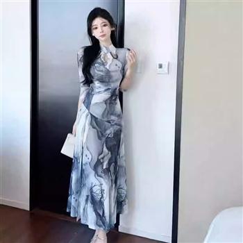 YF3933-图片色优雅时尚民族风长袖束腰开叉扎染印花飘逸雪纺连衣裙