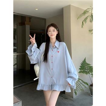 YF3937-图片色时尚小心机爱心刺绣木耳边翻领系扣加大码韩版上衣潮