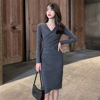 YF3944-(2色入内)2025春秋新款长袖V领褶折修腰包臀简约显瘦连衣裙