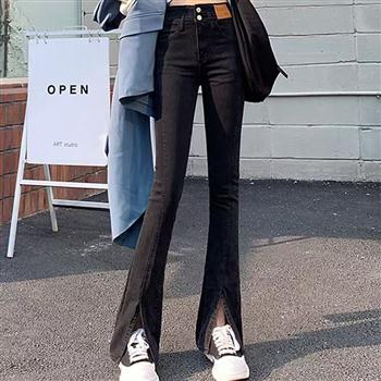 YF3946-图片色时髦秋冬开叉设计紧身包臀显瘦微喇叭辣妹时尚牛仔裤