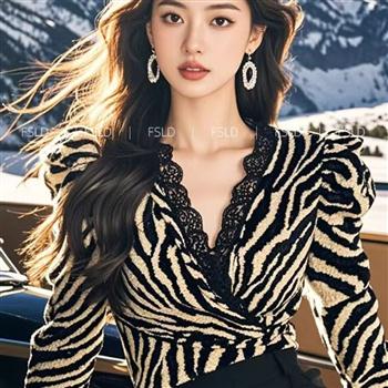 YF3939-图片色甜美时尚斑马纹蕾丝拼接交叉设计感秋季韩版上衣