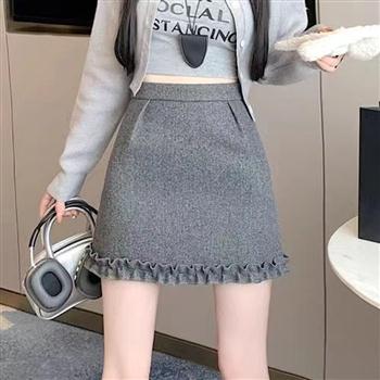 YF3823-(2色入内)法式褶折高腰A字蛋糕围边冬季保暖毛呢西装半身裙
