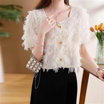 YF3822-图片色韩版时髦设计流苏花朵甜美宽松大码气质小香风小衫