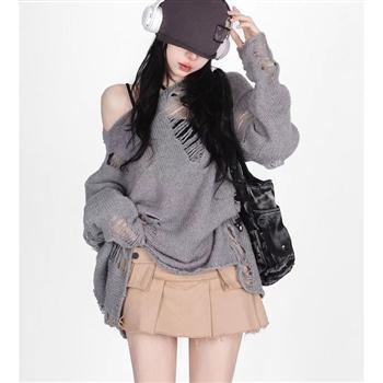 YF3824-图片色慵懒风镂空破洞小众宽松大码秋冬针织衫 时尚性感上衣