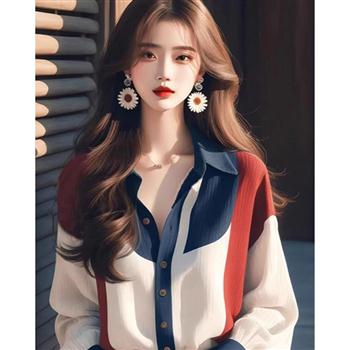 YF3826-图片色韩版别致撞色设计慵懒风长袖翻领宽松大码女装衬衫
