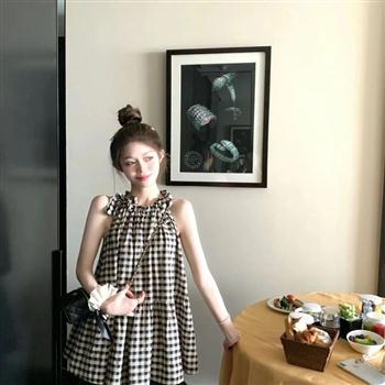 YF3828-图片色小可爱围脖绑绳A字复古格子衫 设计感蝴蝶结背心上衣